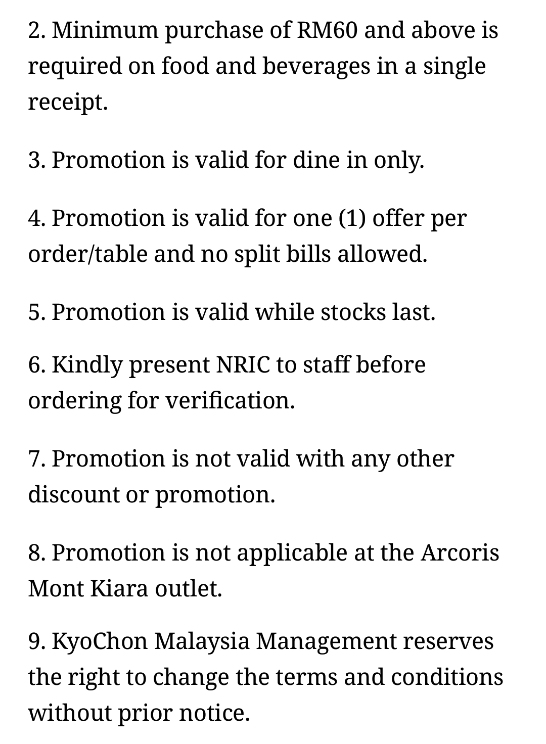 促销地点:全马 KyoChon 1991 分店(除了Arcoris Mont Kiara 分店 )