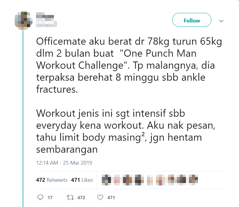 这名大马网友在网上 PO 文说,他的同事在 2 个月内通过 One Punch Man 减肥法成功瘦身,从原本的 78kg 骤降到 65kg。虽然成功减去了 13kg,现在的他却因为该减肥法而脚踝骨折,被迫休息 8 个礼拜!