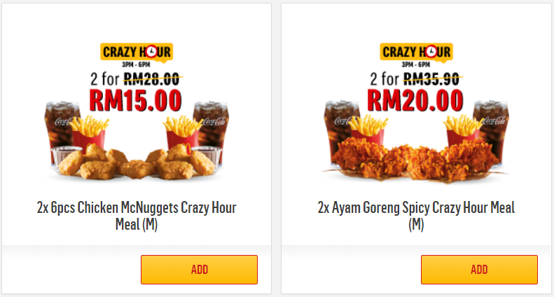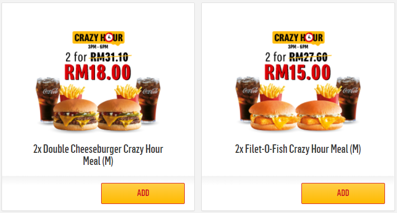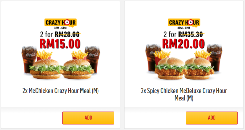 ▼ 2x McChicken Crazy Hour Meal (M) 现在是 RM15.00(原价 RM 28.00)!