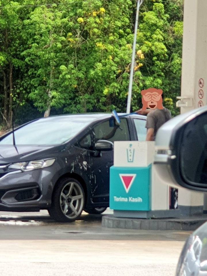 帖文的内容写道:一名槟城男子在 Petronas 加油站轻松自如的洗他的车子。