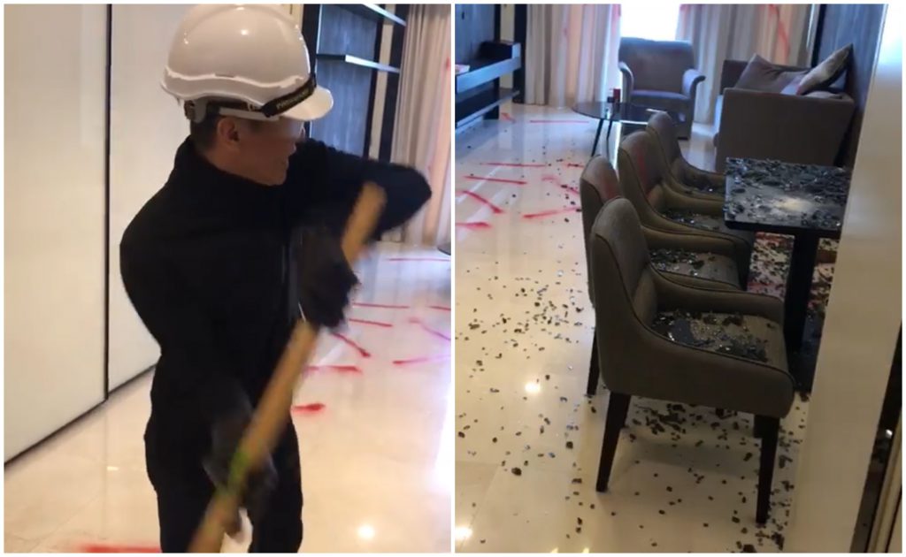 ▼视频最后Uncle更以大锤砸烂大理石的餐桌。