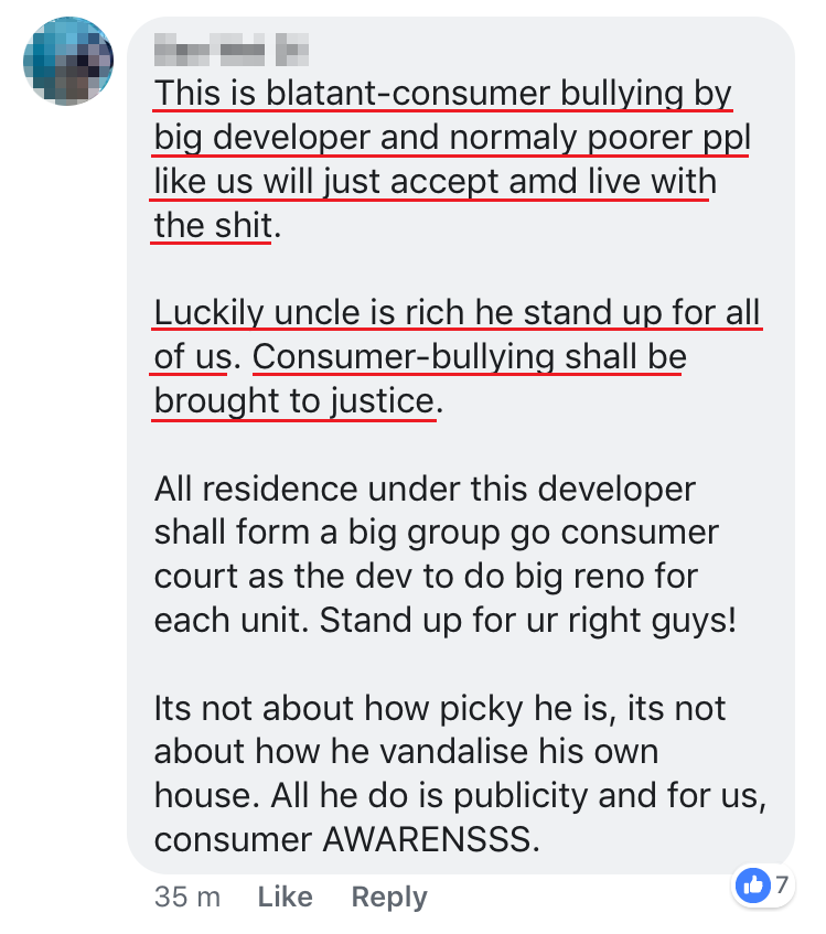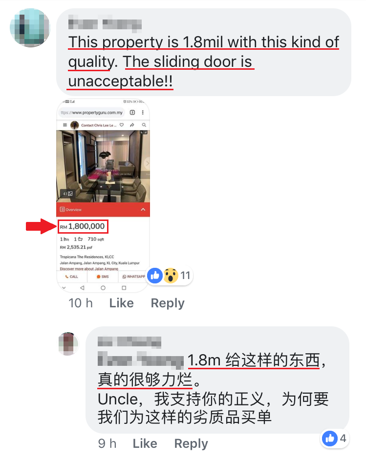 上传此视频的网友并不是视频里的事主,据了解白衣Uncle是以每平方尺RM2000购买了位于KLCC附近的一所豪华(Luxury)公寓,结果发展商交出了很多瑕疵的屋子而且家具都是次等货。
