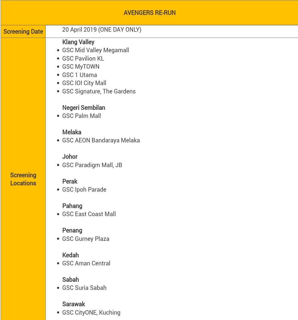 GSC 将在全马指定的 15 家分行,同步上映所有 Avengers 系列的电影!