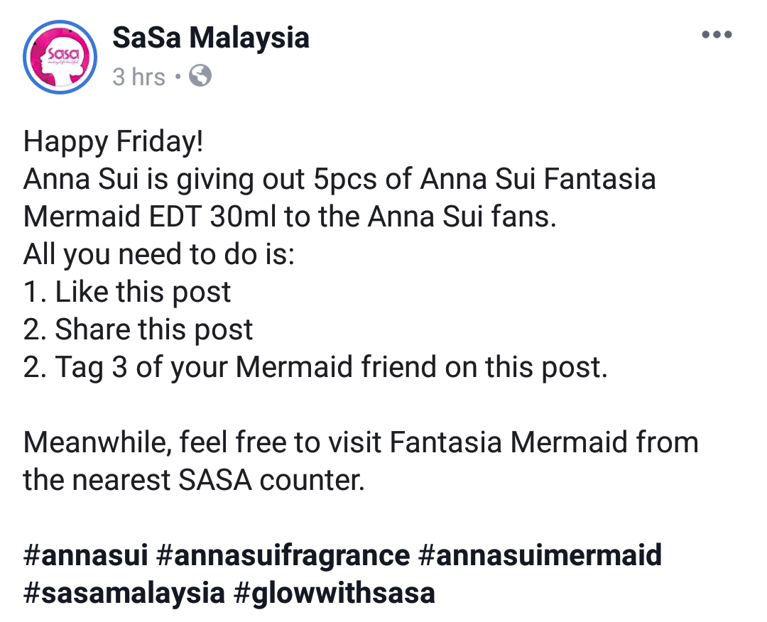 好啦!说了这么多,你是不是也很想拥有这瓶童话美人鱼香水啊!现在机会来了!大马 Sasa 刚刚在官方 Facebook 公布一则好消息:免费送出 Anna Sui 童话美人鱼香水!