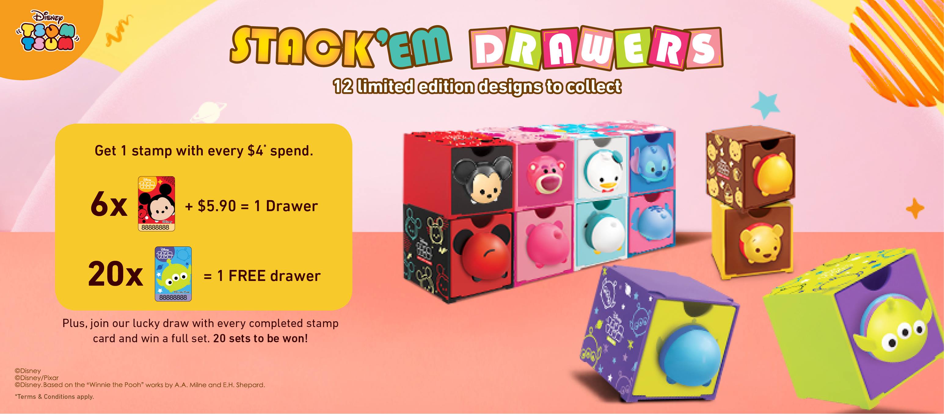 在新加坡 7-Eleven 消费满 SGD 4,便可获得一张贴纸。想要获得 Tsum Tsum 小收纳盒共有 2 种方式: