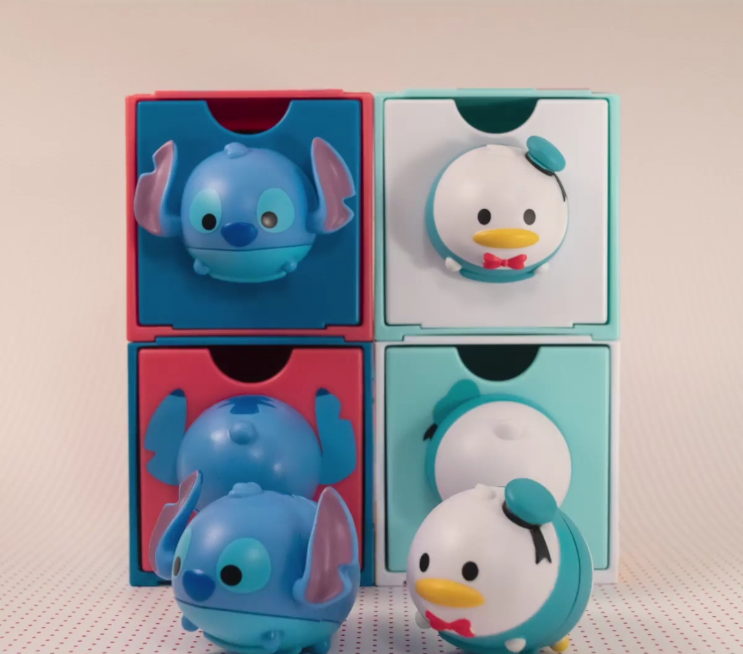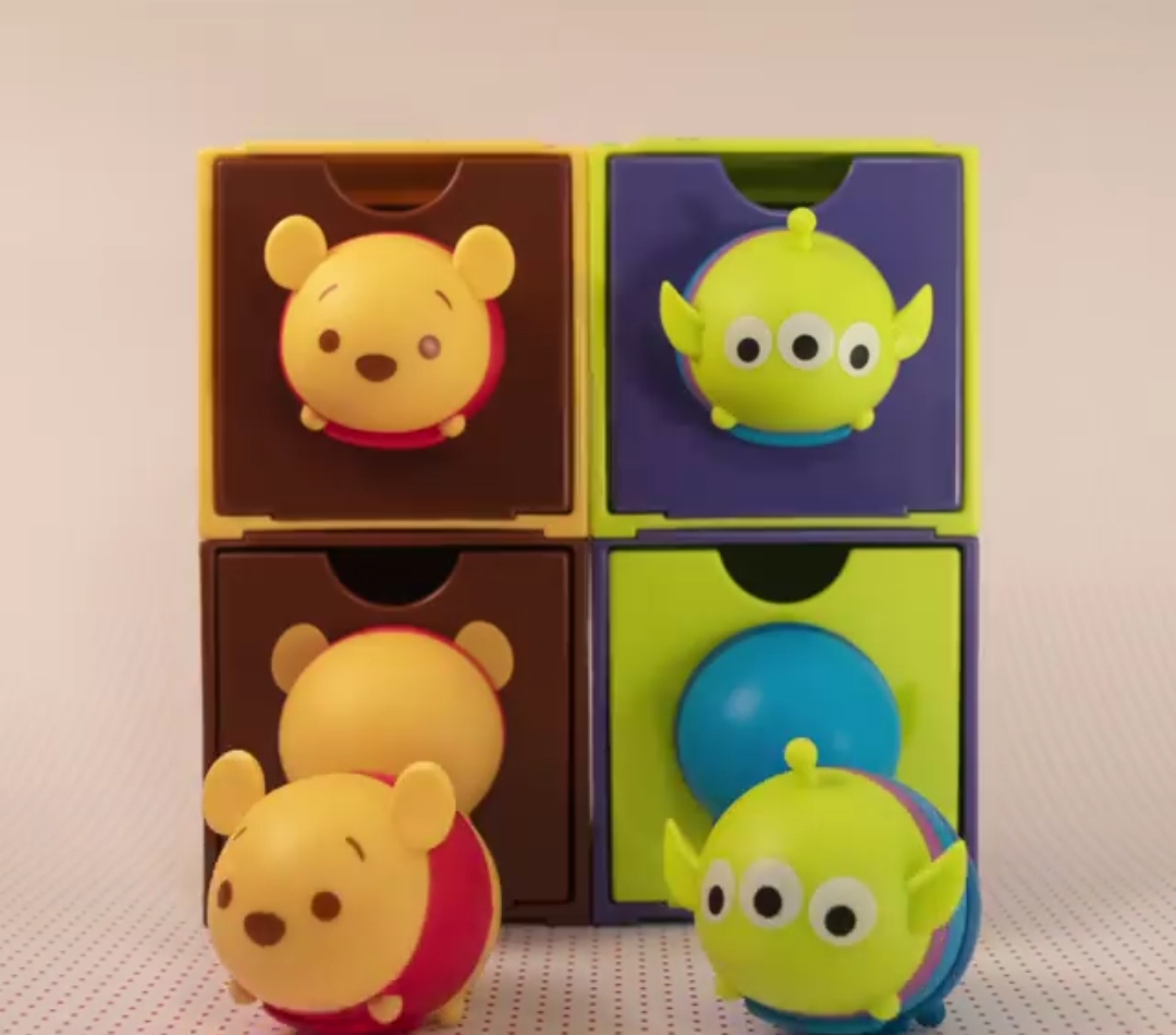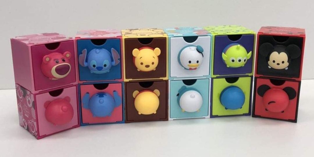 该系列共有 12 种款式,分别是 6 款 Tsum Tsum 的头部以及 6 款 Tsum Tsum 的屁屁。最特别的是:从小收纳盒取出 Tsum Tsum 的头部和屁屁,就可以变成一个 Tsum Tsum 的完整体模型了!