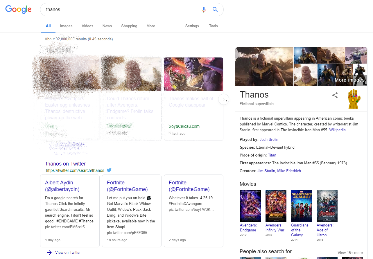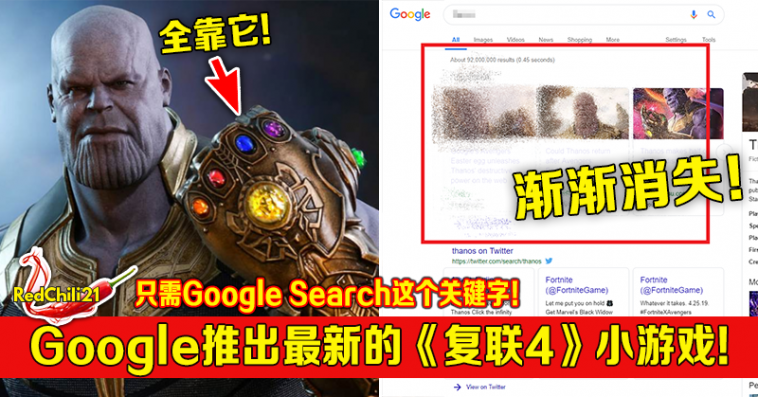 现在大家只需在Google搜寻Thanos,搜寻结果里的资料就会一个一个渐渐消失!