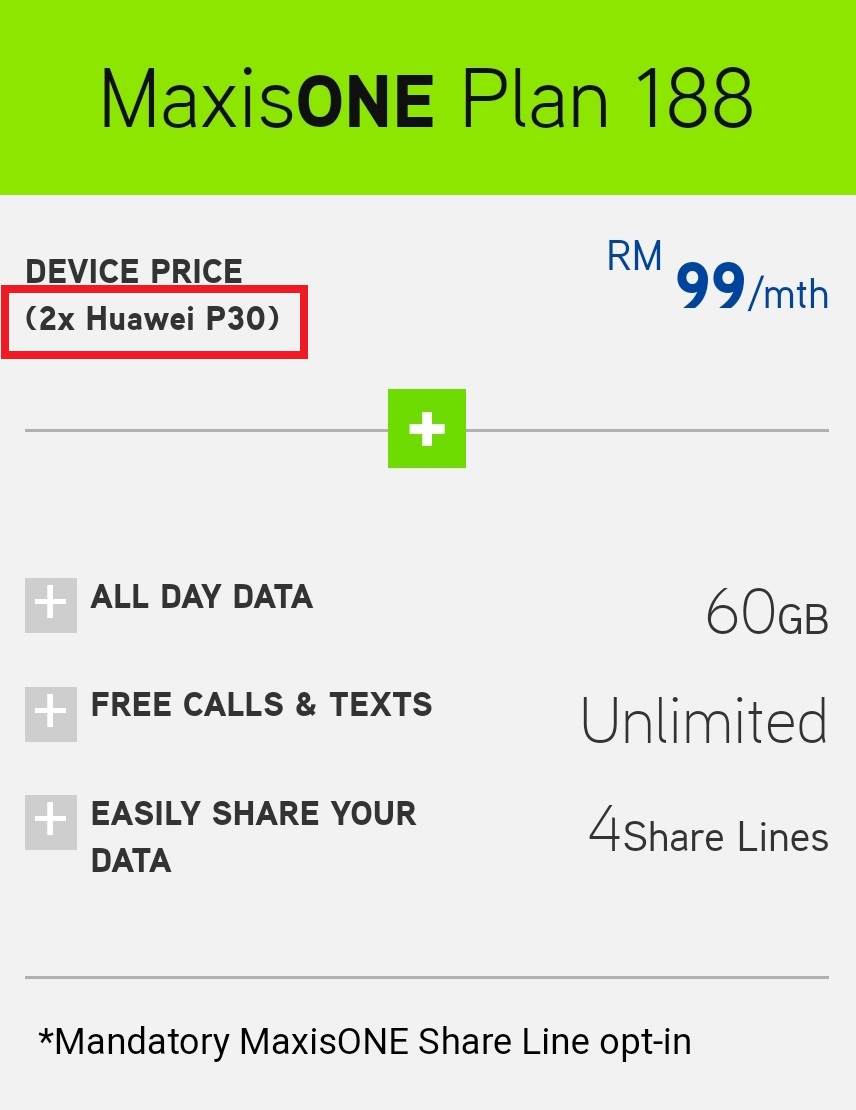 ▼ MaxisONE Plan 188(Huawei P30 买一送一)