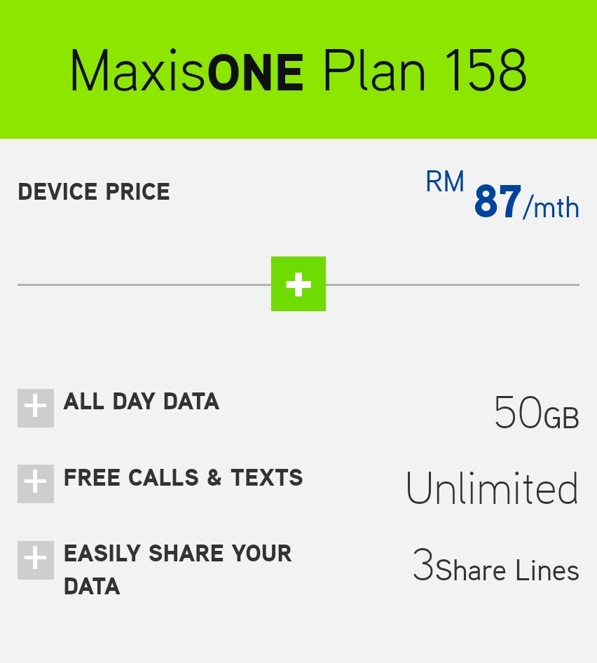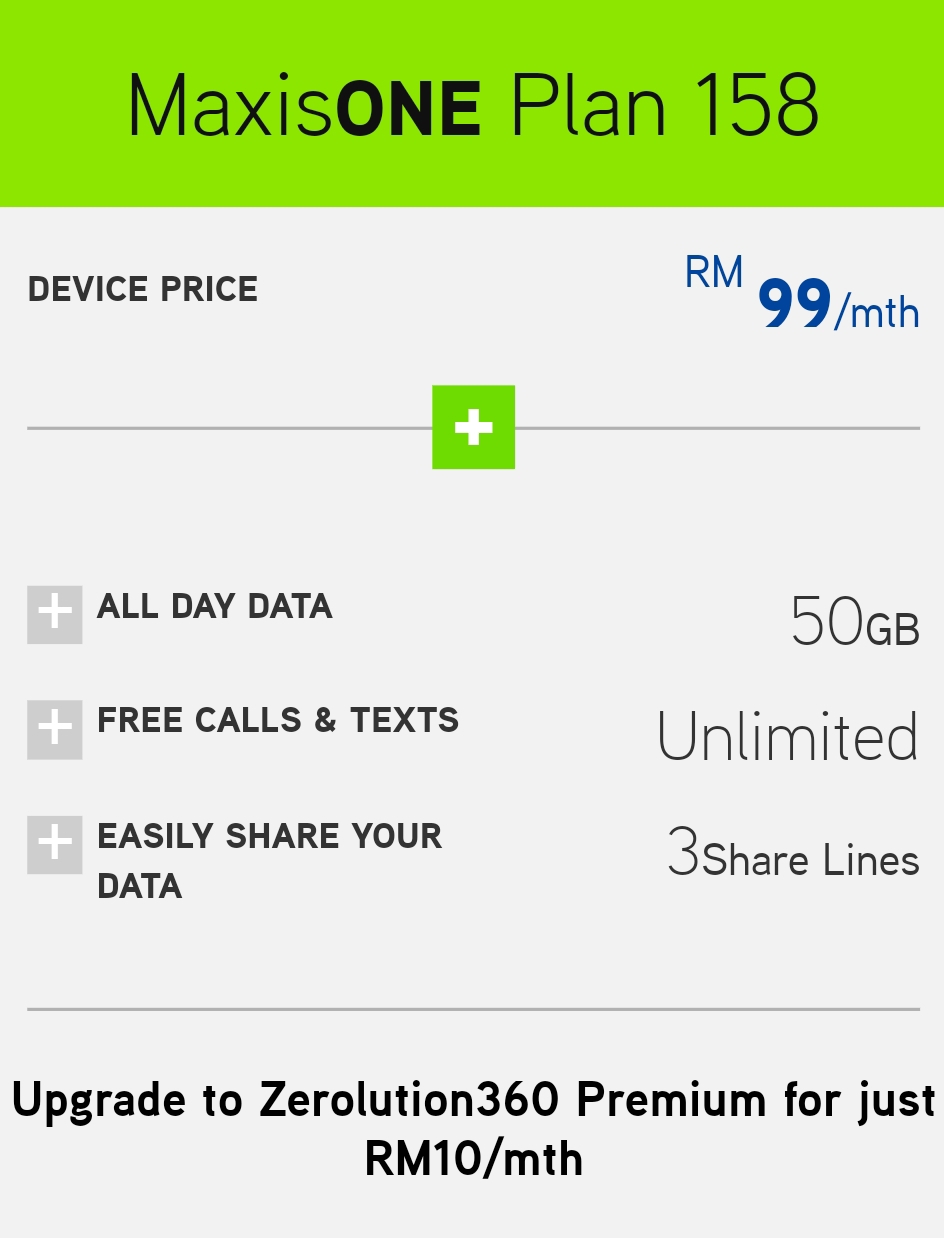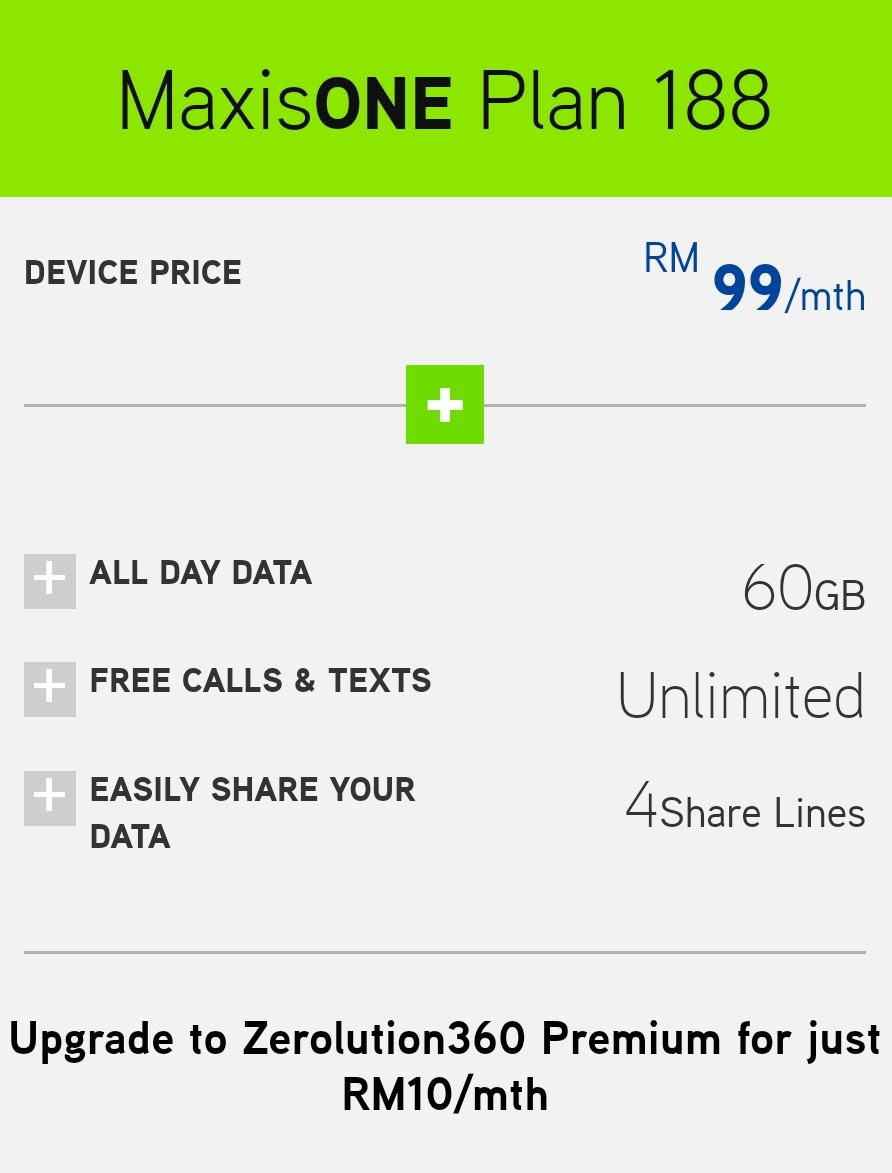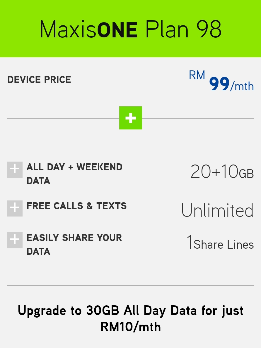 促销条件:开通 MaxisOne Share line – 无限通话和 10GB 上网数据(RM48 / 每月)