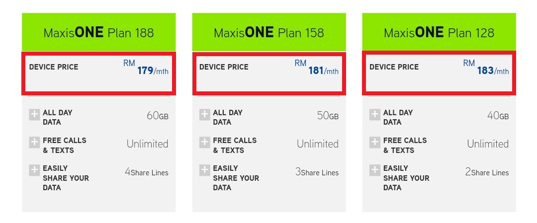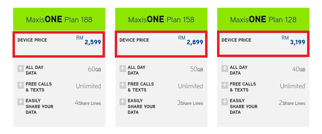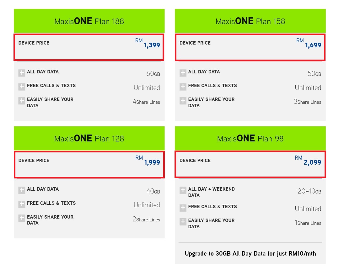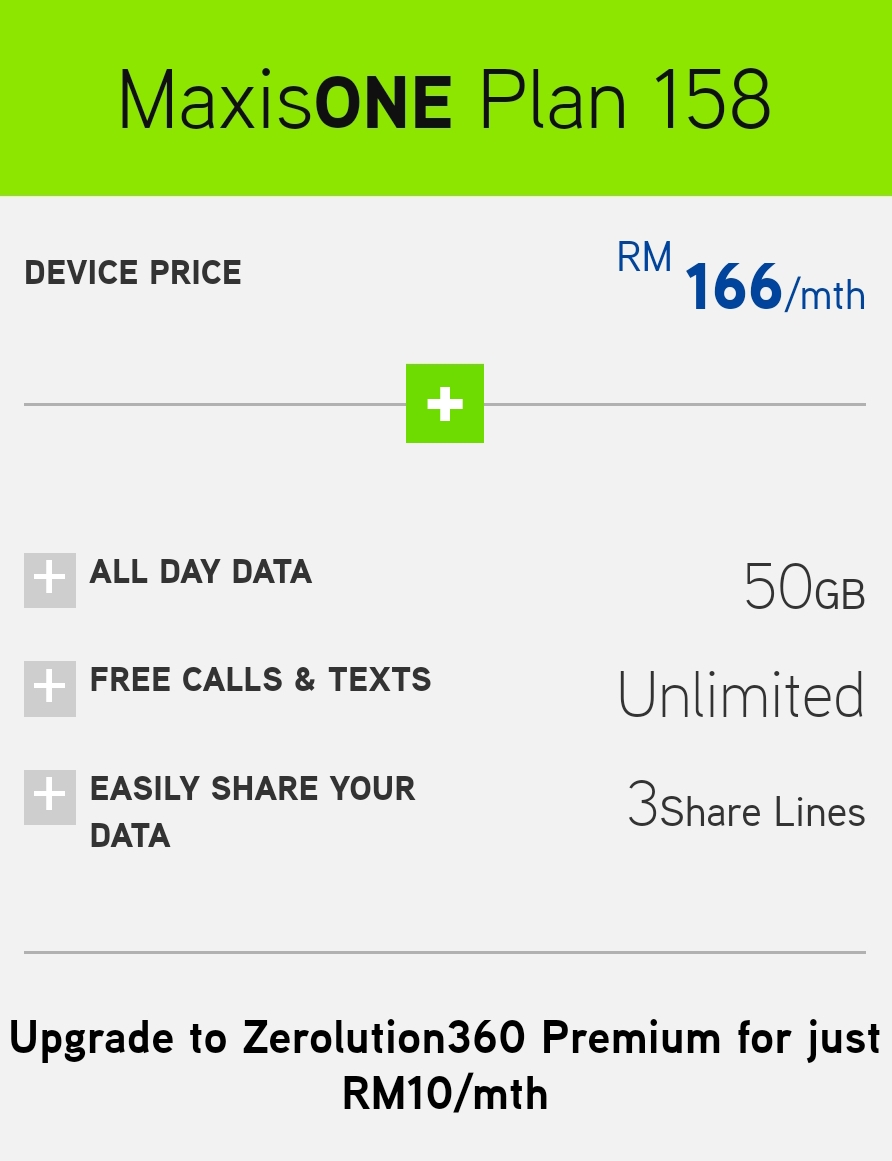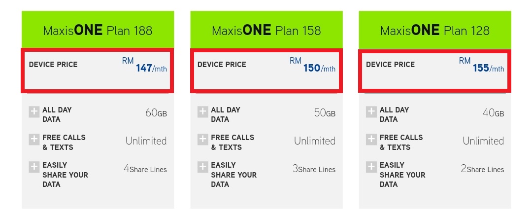 促销条件:开通 MaxisOne Share line – 无限通话和 10GB 上网数据(RM48 / 每月)