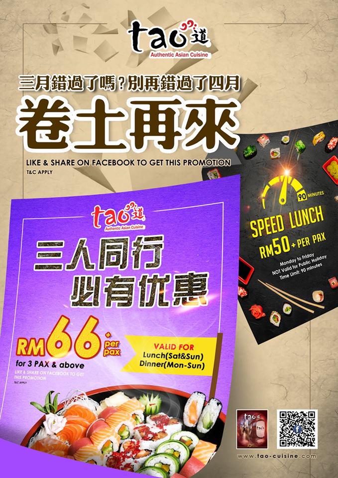著名TAO Authentic Buffet 4月份又推出特别促销活动啦!只要 3 个或以上的人数一起去,一个人就只需付 RM66+ 哦!