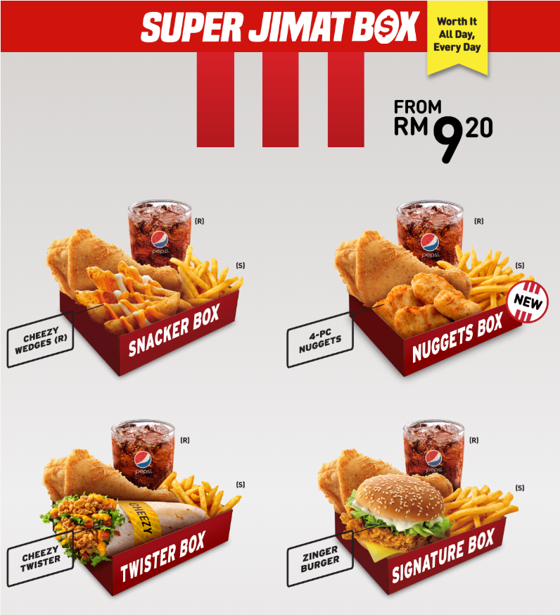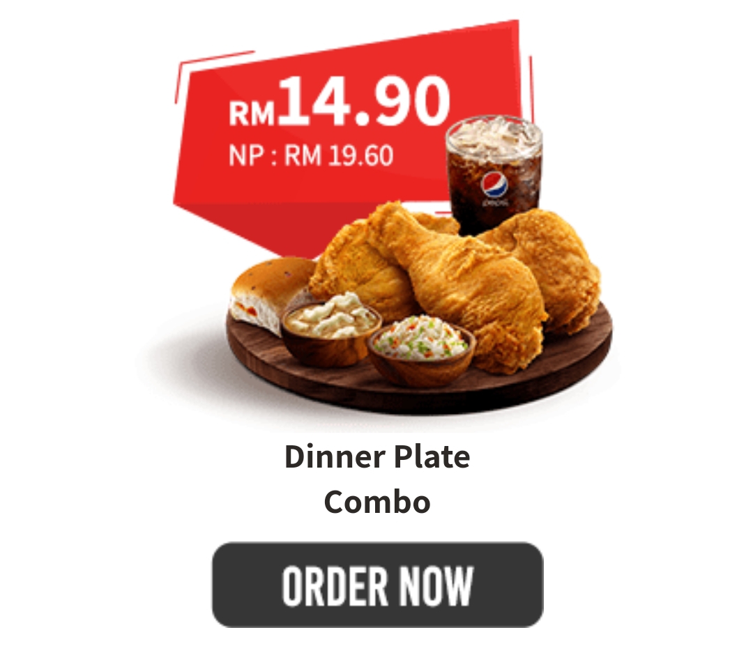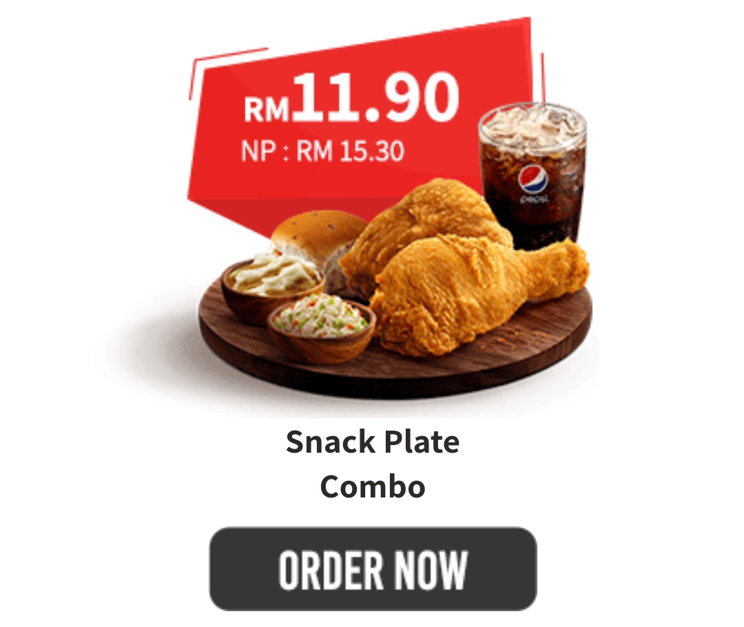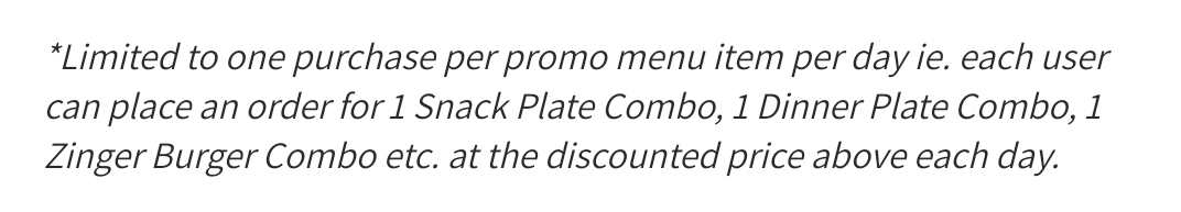* 该促销只限于每一天订购一份。(例如:你可以同时订购 1 份 Snack Plate Combo、1 份 Dinner Plate Combo 和 1 份 Zinger Burger Combo。但是同样的餐点不能订购 2 份或以上。)
