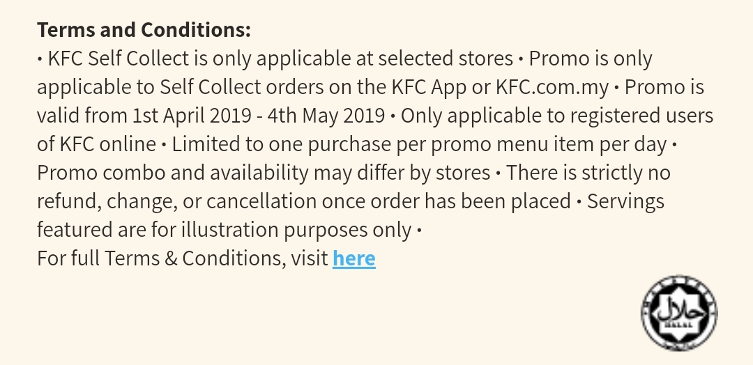 - 该促销只限于在 KFC APP 和 KFC 官网的 Self Collect 餐点订购。