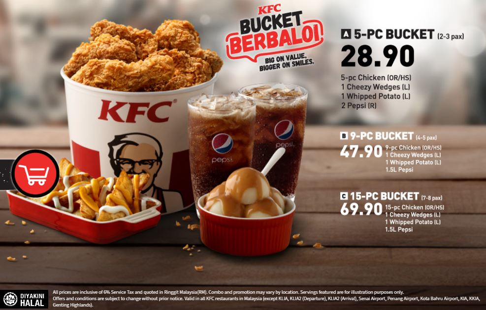 内容:15块鸡(原味/香辣)+薯泥(L)+Cheezy Wedges(L)+Pepsi 1.5L