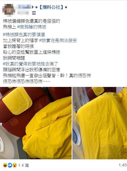 该名网友在面子书里的群组【爆料公社】上发表“ 棉被选错颜色还真的是怪怪的 ”,并上传某航空公司的商务舱照片。