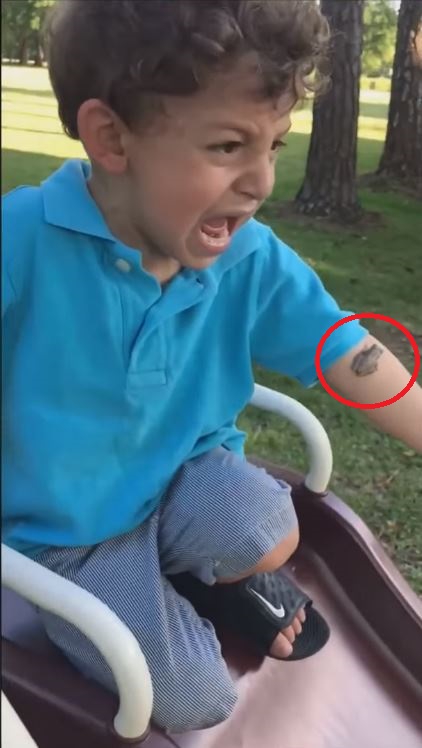 一开始,小男童坐在滑梯上爆哭,妈妈走向前去看发现原来有一只青蛙在男童的手臂上。