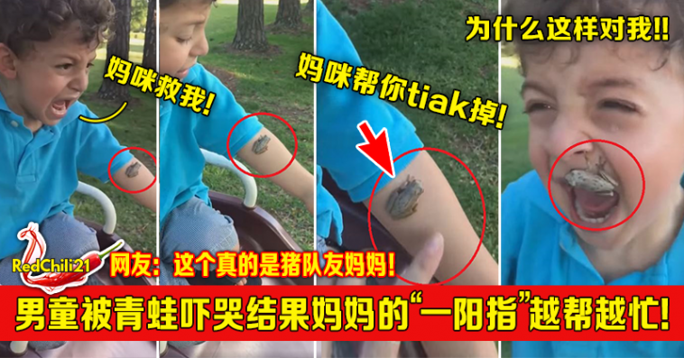 妈妈便伸手过去帮忙赶走青蛙,怎么知道妈妈的“一阳指”tiak下去,青蛙便马上跳到小男童的嘴巴上,小男童直接哭得更大声了!