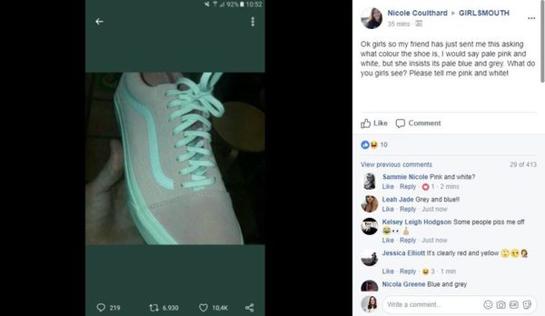 外媒引述Nicole Coulthard 声称,该图是从Nicole的朋友传来。朋友指出购买了一双粉白色VANS,拍摄照片传送给母亲,并分享问这双鞋子是否漂亮。可是母亲竟然回应‘蓝色适合你’。朋友感到疑惑,但当他再看看图片,竟然也发现是‘蓝色’的。