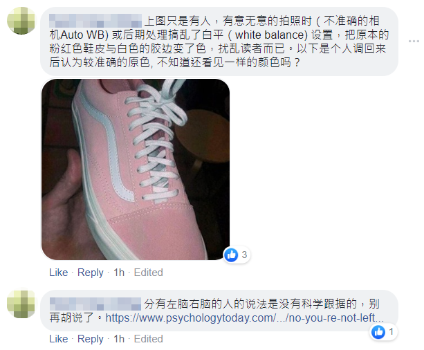 不过根据《中国报》报道,大家会看到不一样颜色的原因是与“色彩恒关系”有关。看到灰绿色的人,是因为大脑自动无视绿色光源,不觉得这张照片的显色是因为绿光才造成了这种颜色,所以灰绿色一定就是这双鞋的颜色。