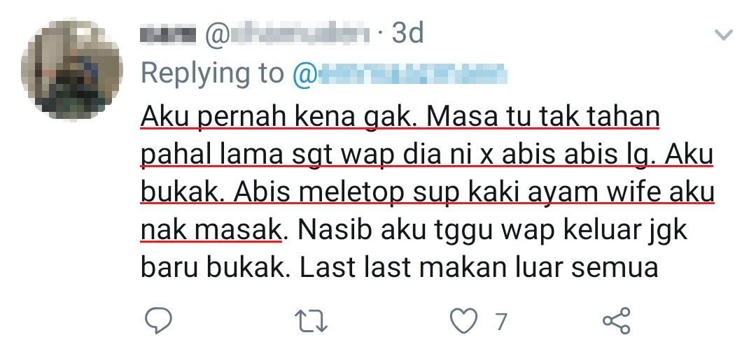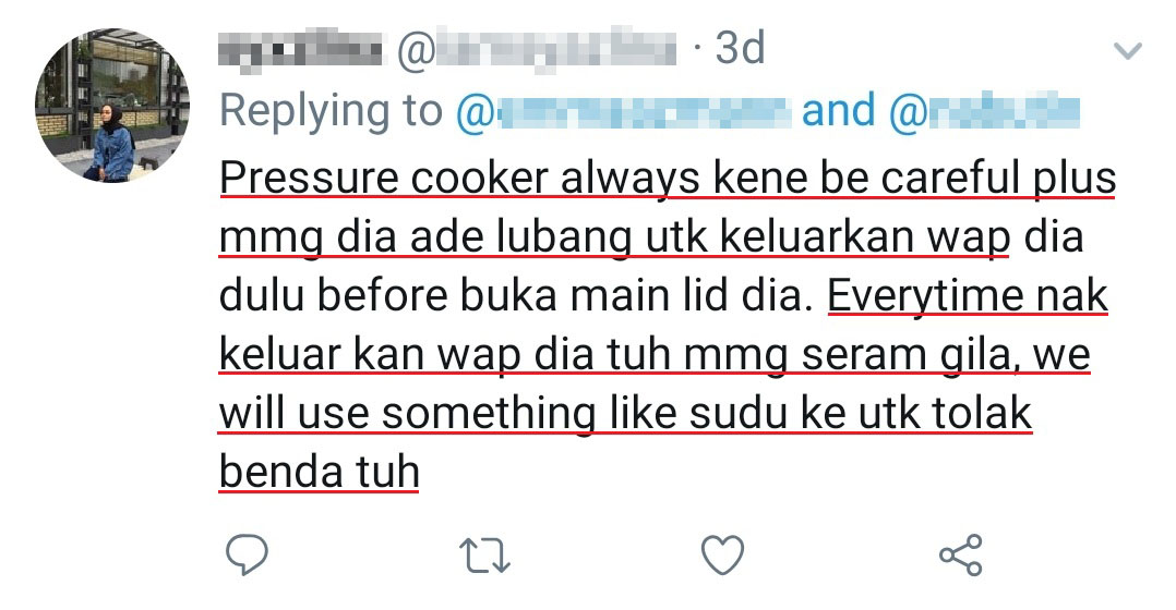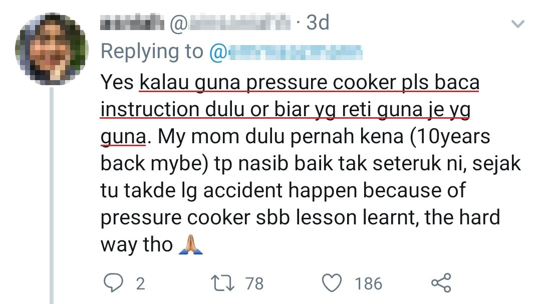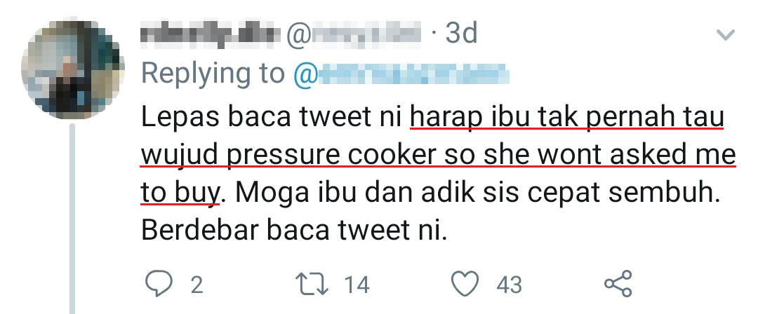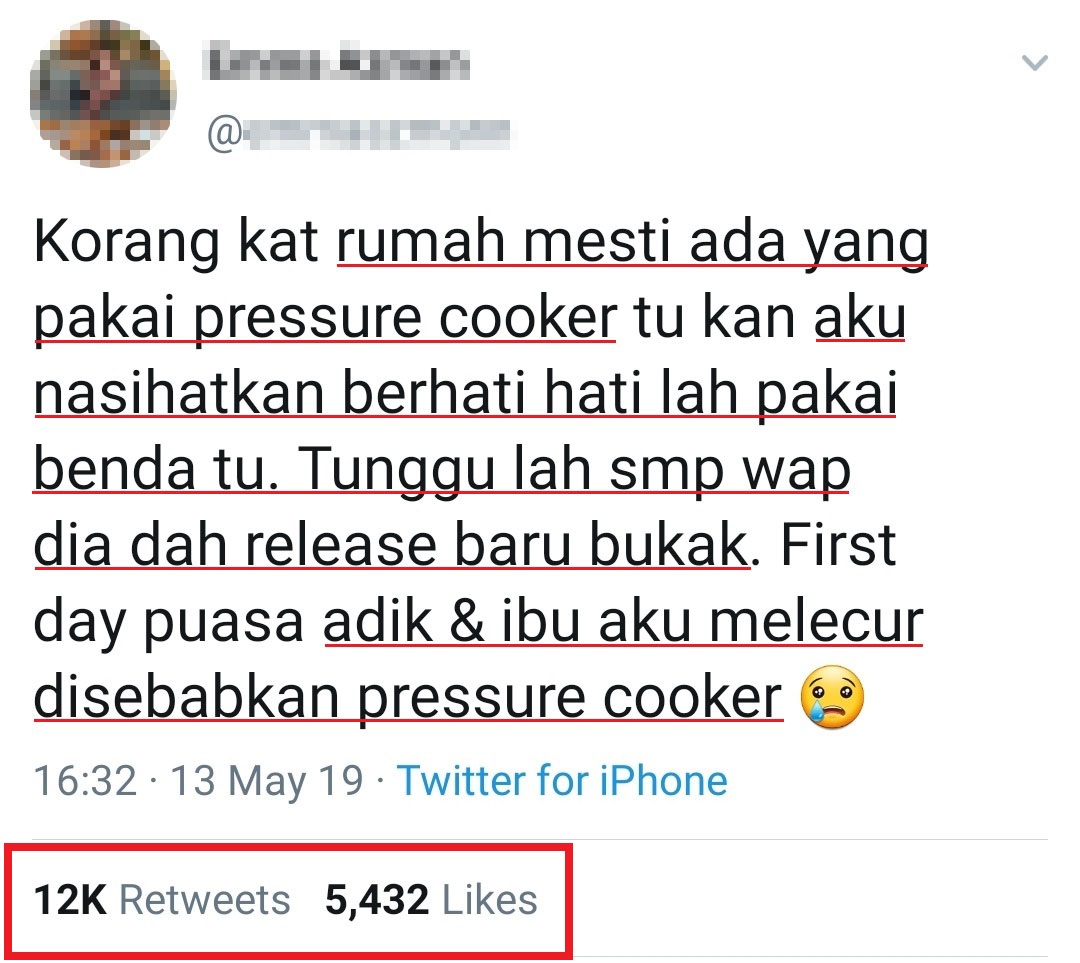 该网友在推特说道,事发当天,由于再过 15 分钟就要开斋了,妈妈要打开气压锅的时候,因为太紧了,所以就请弟弟帮忙打开。