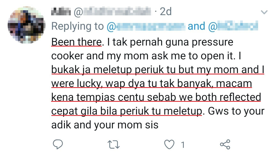 相信很多家庭都有一个气压锅(Pressure cooker),因为即方便又省时。然而日前大马有一名网友就在推特(Twitter)PO 文,家里因为气压锅而发生爆炸,导致家人严重灼伤!