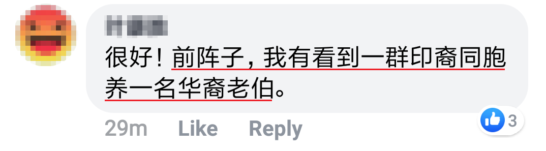▼ 也有网民表示「前阵子看到一群印裔同胞养一民华裔老伯」