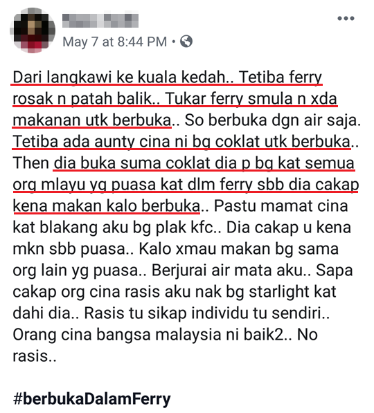 该名华裔Aunty将巧克力传给在座马来同胞。一名网民Nast Seth于周二在脸书发贴文表示,由于更换客船原故,船上的穆斯林赶不上开斋,只好喝白开水开斋。他说,忽然有一名华裔女子取出巧克力,派发给船上的穆斯林乘客吃,还表示开斋必须要吃点东西。该名华裔Aunty将巧克力传给在座马来同胞。