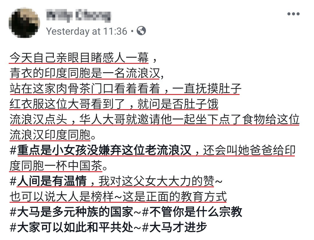 原PO表示他亲眼目睹该名红衣男子因为看见那位青衣男子站在肉骨茶门口看了很久,并且一直抚摸肚子,因此邀请他一起坐下,点了份食物给这位流浪汉印度同胞。