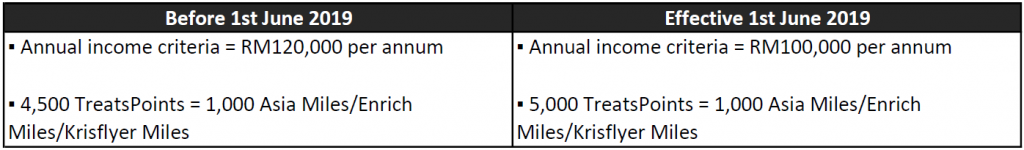 – 6月前:每年至少消费RM50,000才能免年费,4,500 TreatsPoints就能换取1,000 Enrich Miles