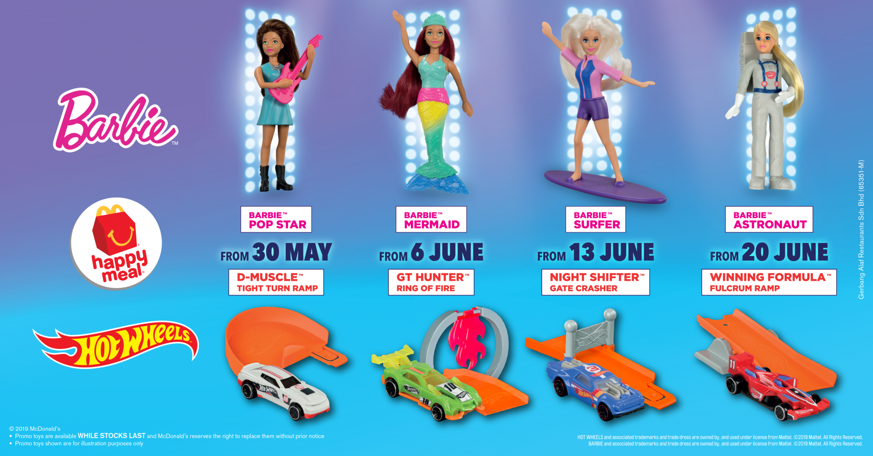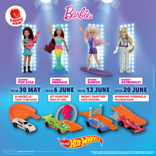 收集麦当劳(McDonald’s) Happy Meal 玩具的时候又到啦!这次不但有玩具,还有故事书呢!!!这次的玩具系列是 Barbie 和 Hot Wheels!