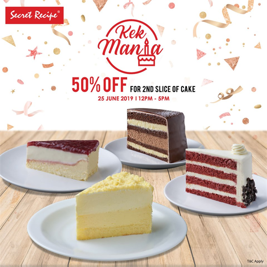 促销活动:Secret Recipe Kek Mania 优惠(第 2 片蛋糕 50% 折扣)