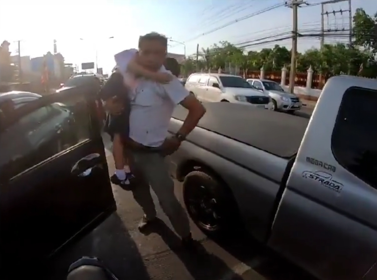 ▼ Itthiphon 见状后立刻停下摩哆,走去请求一辆又一辆四周围的车辆移动并让位,让 Sorachat 能够把车停在大路的边道。