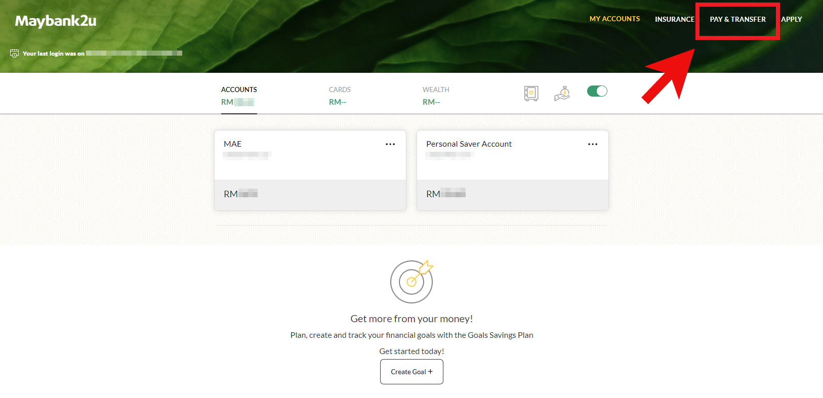 ▼ Step 1:在 Maybank2U 网站 登入 Maybank2U 账号以后,点击 “PAY & TRANSFER”。