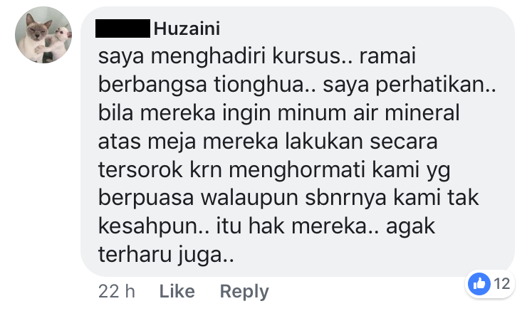 ▼Huzaini: 还记得,我和很多华人参与了一个课程。我留意到每当他们喝水的时候都是躲起来的因为要尊中我们在封斋着的马来人。其实我们是不介意的因为这是他们的权利但是觉得很感动的。