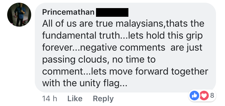 ▼Princemathan: 我们都是真正的马来西亚人,我们不要去看那些不好的评语/留言和试着去回复。就让我们一起握着同一个国旗前进。