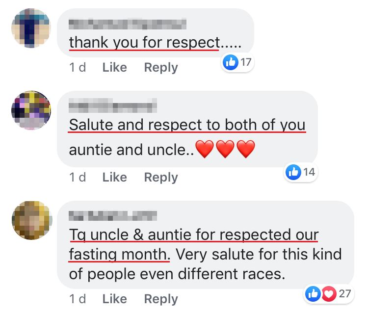 但是华人Uncle始终没开动,这一幕感动了Mohd Fuzaimie Faizan所以他也在脸书帖文感谢这位Uncle那么尊重他们的文化。