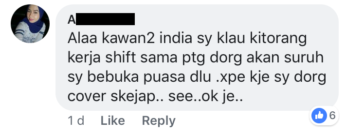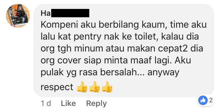 ▼Ha: 我的公司也有各种族,每当我上厕所都会经过公司的饮食处,如果当时他们在喝还是吃着东西都会设法遮着食物然后跟我道歉的。反而是我觉得更不好意思,不管如何他们真的值得尊敬的。