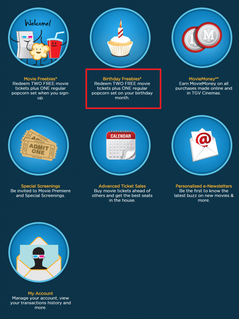 优惠活动:生日可获得免费戏票,分别是 GSC、TGV 和 MBO 电影院各 2 张。