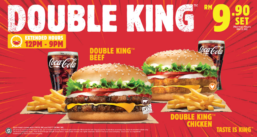 如果你觉得这样还吃不饱的话,没关系!还有 Double King 的套餐优惠!此优惠原本只限于午餐时间,但现在 Burger King 决定延长时间至晚上 9pm!所以晚餐也能享有此优惠了!