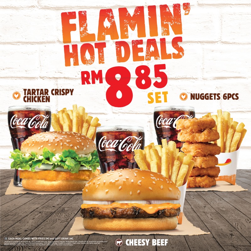 这次的Burger King优惠一份套餐只需 RM8.85 !每份套餐除了有汉堡或鸡肉块以外,还有薯条(中)和汽水(中)!