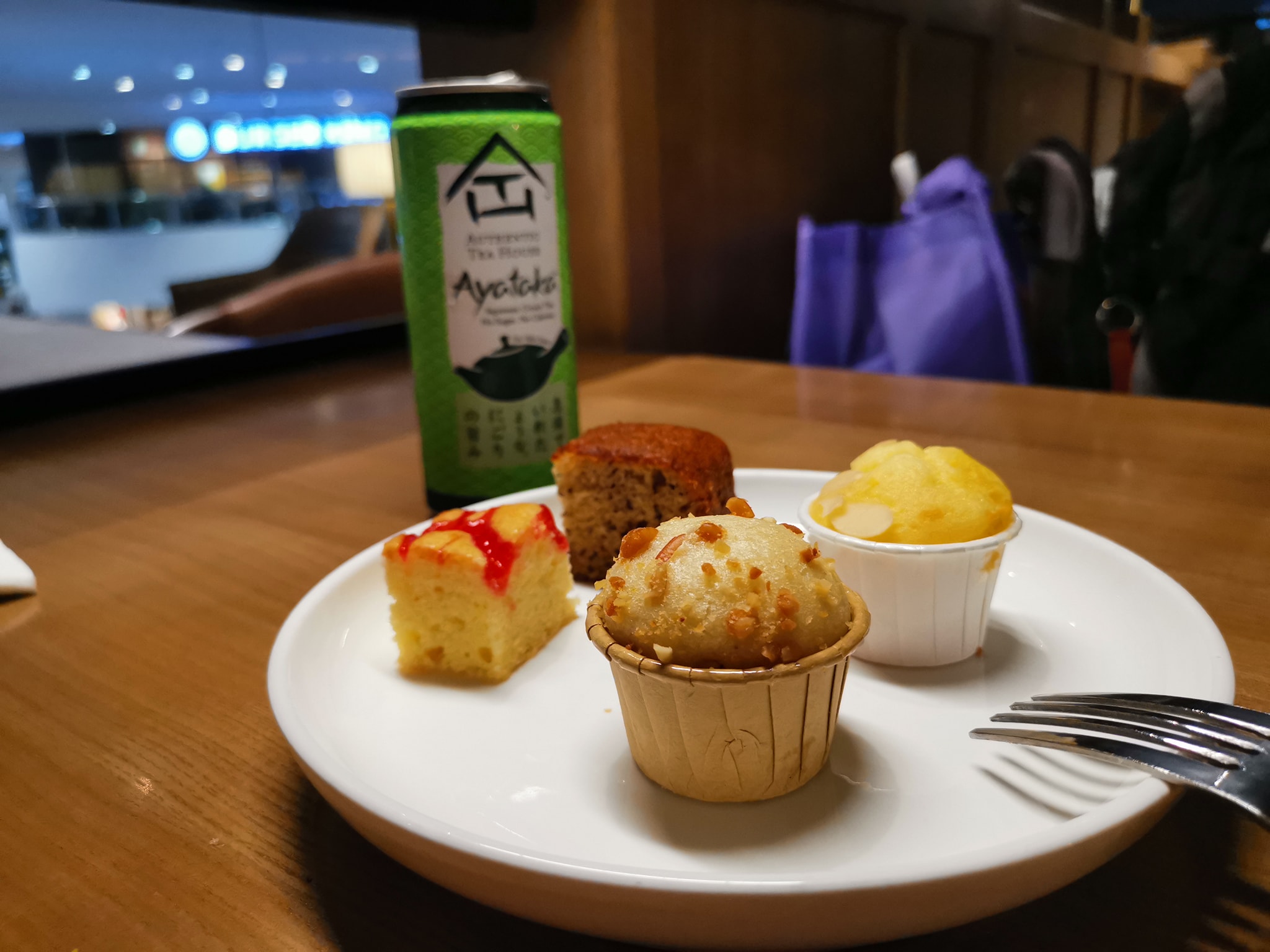第四round?️: 冰绿茶(罐装,无糖),糕点?。这建议还是不要吃,很干,需要配饮品才能吃下去。汽水也任你喝。