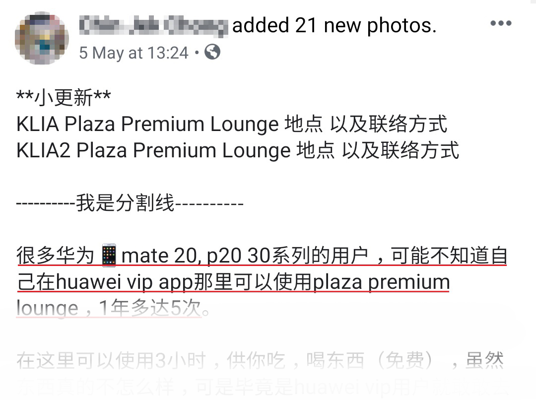 Huawei 的用户们,赶快看过来咯!近日有一名热心的网友大方地在 Facebook 和大家分享了一个好康,立刻引起热烈反应!原来是 Huawei 手机的用户可以免费在机场吃吃喝喝!