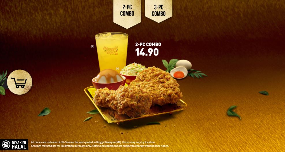 - 2-PC combo包括两块Golden Egg Crunch,一个薯泥(R),一个coleslaw(R)还有一杯饮料(R)。