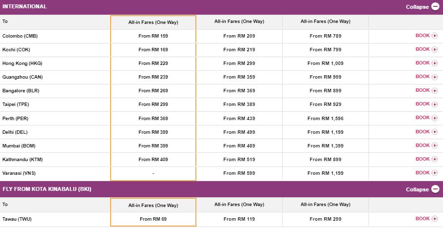 接下来,一起来看看从吉隆坡飞往各目的地的价格表!