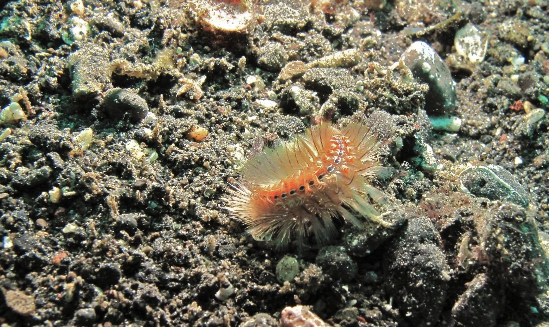 黄海毛虫是一种多毛类的生物。白天的时候藏在海底的沙子中和石头下,所以你不会轻易看到它们。晚上的时候,它们便开始活动。它们身上带着剧烈的毒,被袭击的对象会瞬间感到剧烈的疼痛。