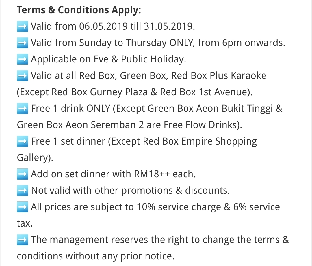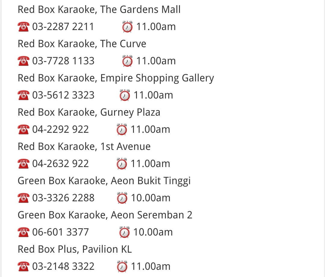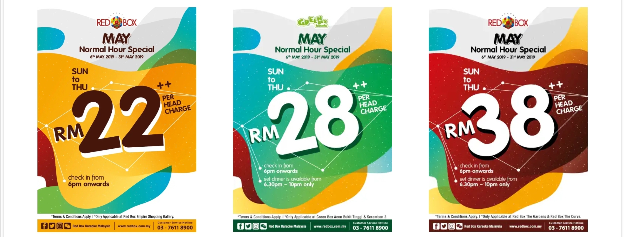 - 全马Red Box, Green Box, Red Box Plus Karaoke 分行(除了Red Box Gurney Plaza 及 Red Box 1st Avenue)