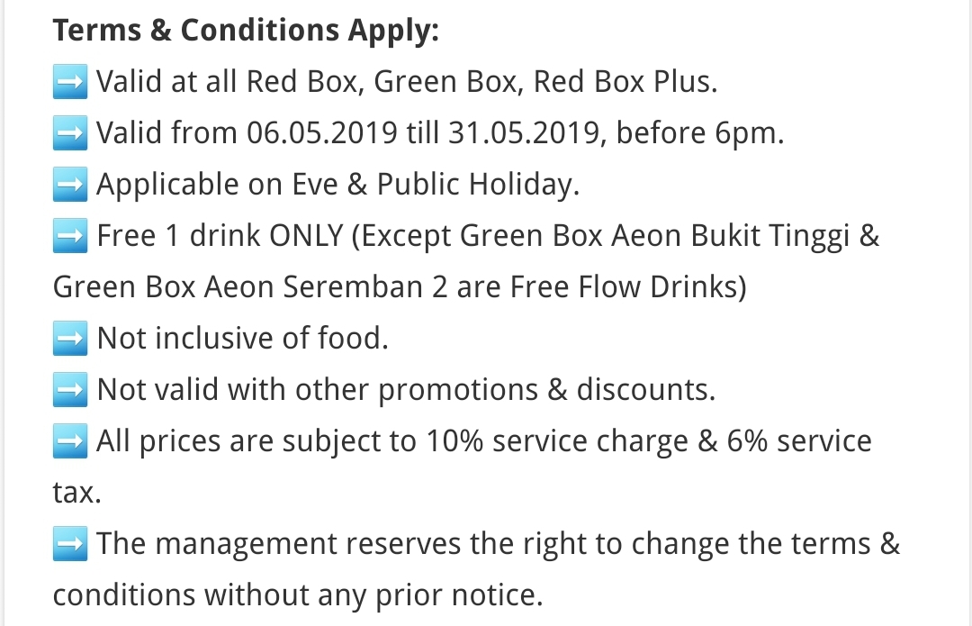 - 免费1 杯饮料(除了 Green Box Aeon Bukit Tinggi 和 Green Box Aeon Seremban 2 可以无限量享有饮料)。