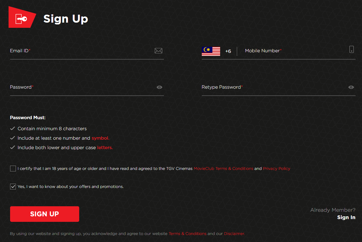 ▼ 申请方式非常简单!只需填写 Email Address 、手机号码以及你要设定的密码。点击“SIGN UP”以后,就会收到来自 TGV 的验证 Email,完成验证就正式成为会员啦~