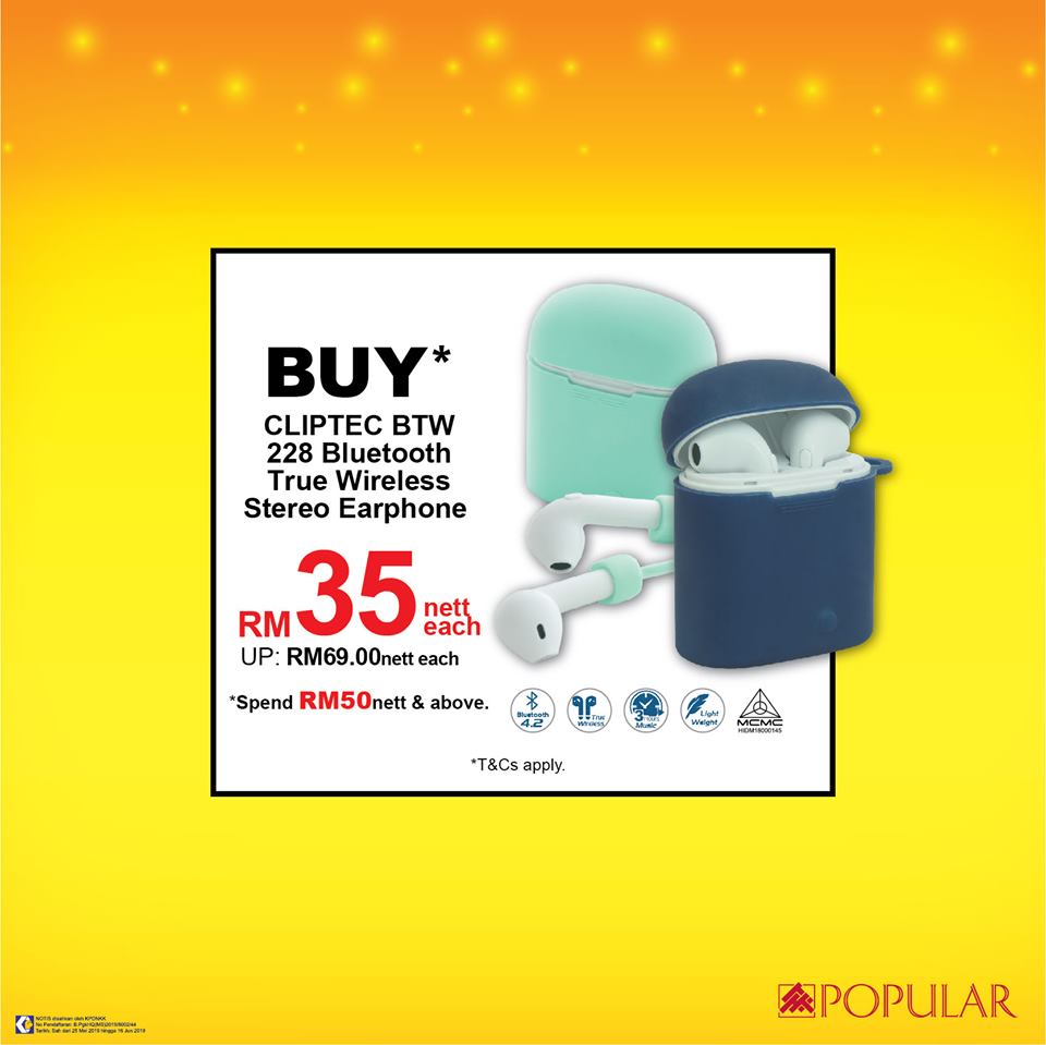 ▼若消费达RM 50或以上,即可以RM 35的价格购买Cliptec BTW 228 蓝牙无线耳机(原价RM 69)!