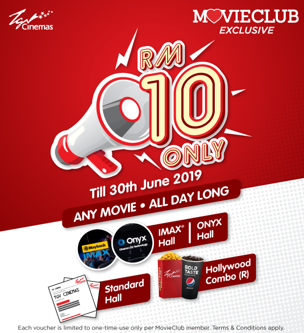TGV 电影院在这个月送出 5 张礼券给 TGV 会员们(MovieClub)!而该礼券就是电影票只需 RM10 !此外还有爆米花配套也是只需 RM10 !